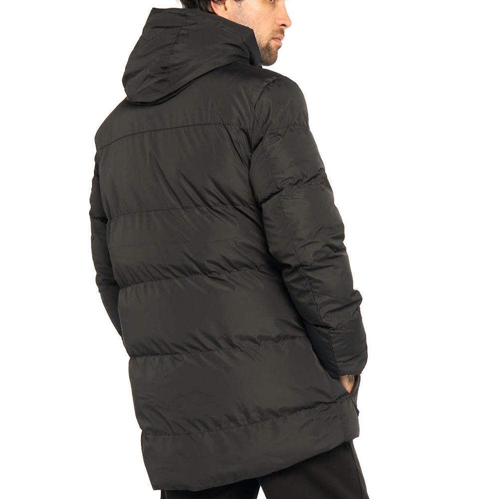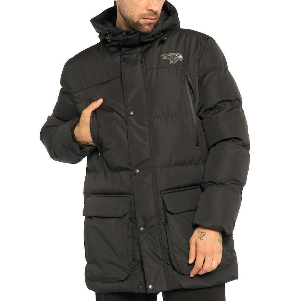 Зимняя мужская куртка удлинённого силуэта из плотного материала с водоотталкивающей пропиткой, логотип выполнен в виде полимерного шеврона.